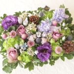 オレンジやボルドーの花、ドライの葉っぱや木の実を添えると、