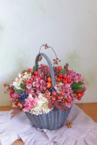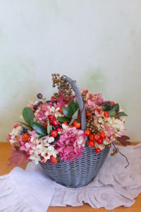 先週土曜日と同じくあじさいの仲間のミナズキや秋の実物をたっぷり使って