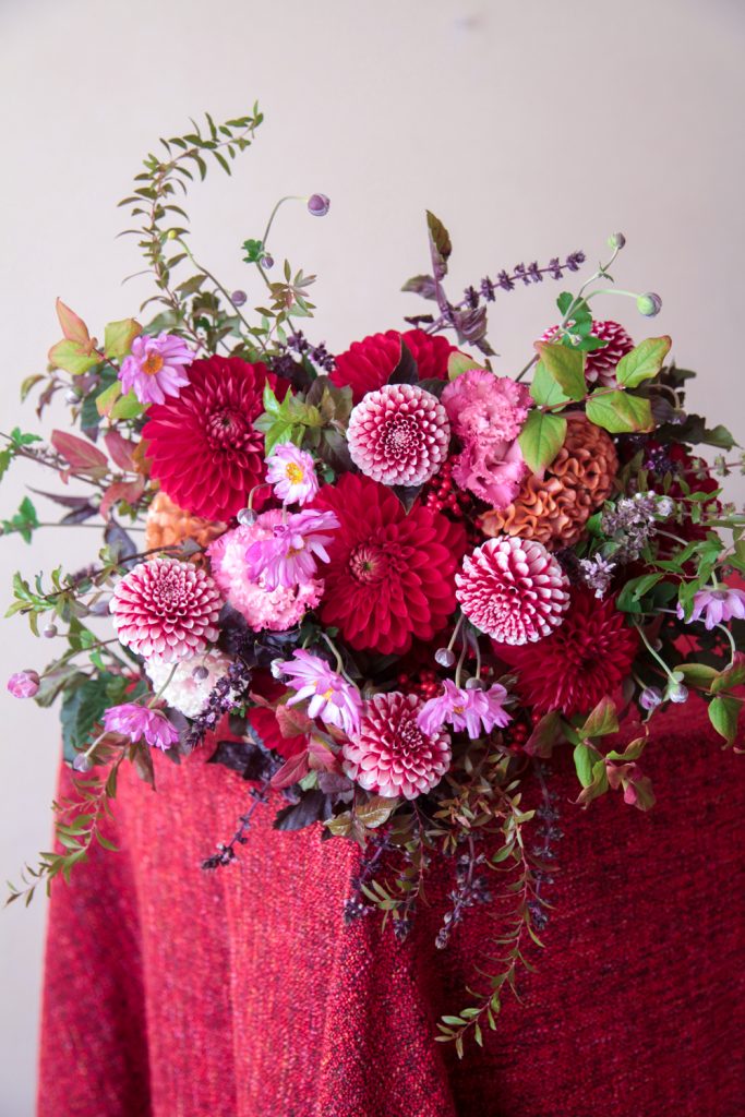 赤の濃淡やフューシャピンクに深い紫を重ねた色合わせは、