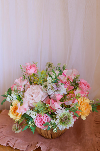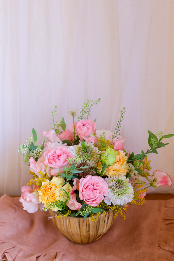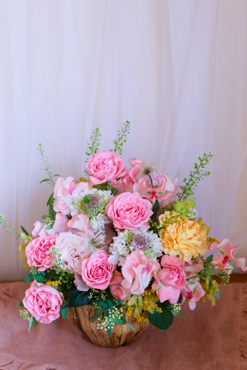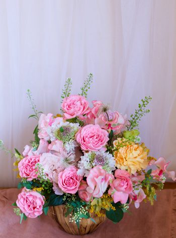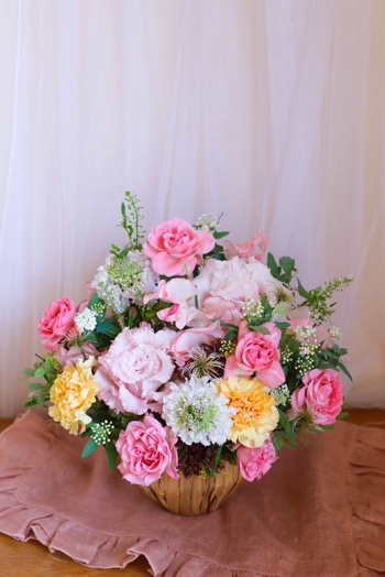 優しい色合いの花を多く使ってアレンジしていただきました。