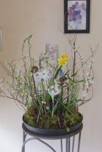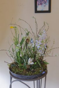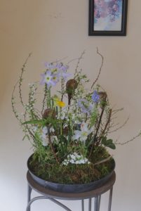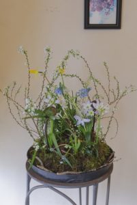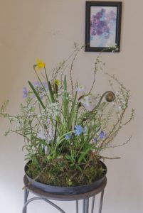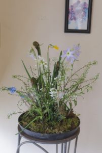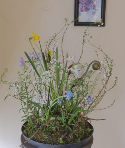 今回も球根の花をメインに野草のような花を合わせ、苔を入れた