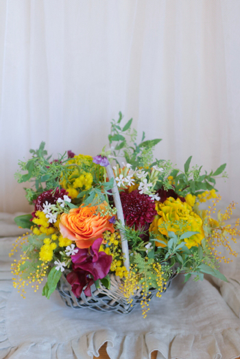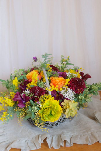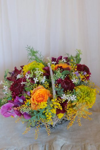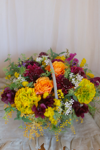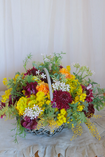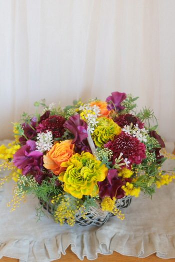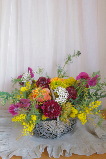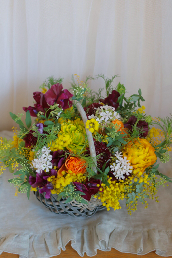本日使った花材はミモザ、ラナンキュラス、スイトピー、桜小町、スカビオサなど。