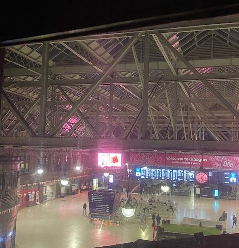 夜にホテルの部屋から駅構内を見るとさすがに人が少なくなっています。 この景色ともお別れでまたグラスゴーから電車でロンドン …
