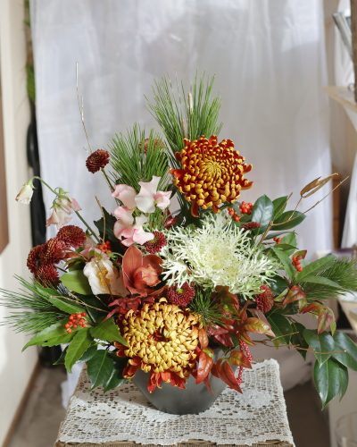 本日は朝からたくさんの方々にご来店いただき、ありがとうございます。 お正月飾り、お正月アレンジなどご購入まことに有難うご …