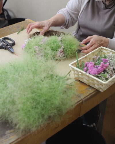 今日は店舗のレッスンルームでワンタイムレッスン 「スモークツリーを使ったフワフワリース」のレッスンが開催されました。 ス …