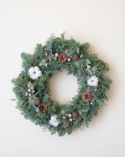 今日は午前、午後ともにワンタイムレッスン。 午前は馬蹄型リース、午後はスワッグ、キャンドルアレンジメント、リースを作る …