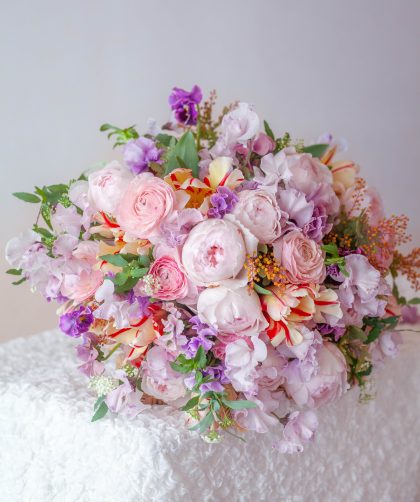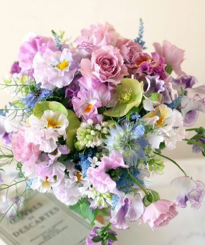 春の花をたっぷり使ってブーケを作りました。 チューリップ、バラ、スイトピー、ラナンキュラス、パンジーなど 春の花がタップ …