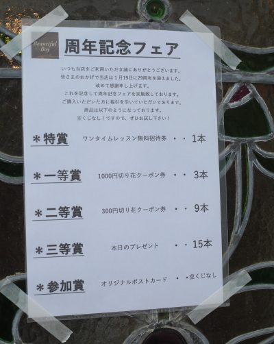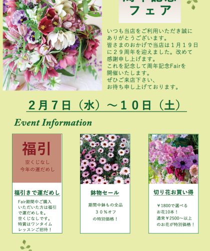 明日2月7日から店舗で周年記念フェアを開催致します。 当店は今年1月19日に皆さまのおかげで29周年を迎えました。 それ …