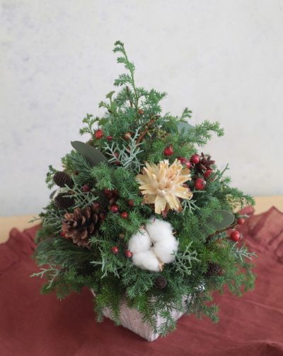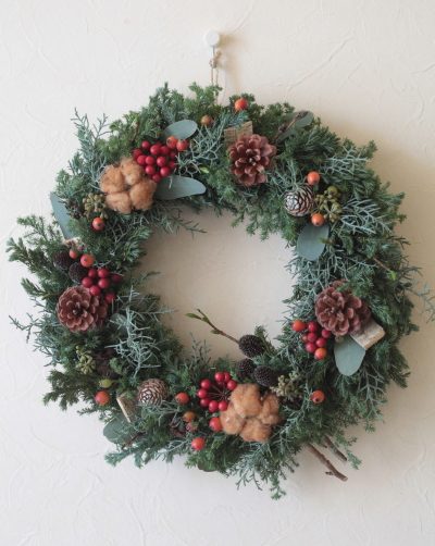 今日から生素材を使ったワンタイムレッスンの クリスマスレッスンが始まりました。 クリスマスには欠かせないひむろ杉、ブルー …