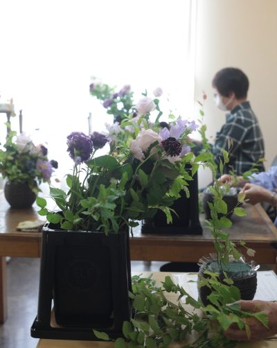 本日は店舗のレッスンルームで5月のワンタイムレッスンが開催されました。 今回のテーマは「新緑の枝を使って」です。 5月ら …