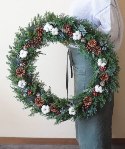 先日店頭にご来店いただいたお客さまから特大のリースのご注文をいただきました。 直径60センチほどのリース。 大きくてとう …