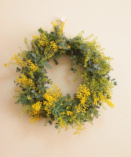 今日は午後からワンタイムレッスンが1コマ。 今日のレッスンでは「ユーカリとミモザのリース」をお作りいただきました。 今年 …