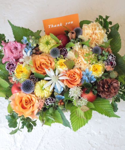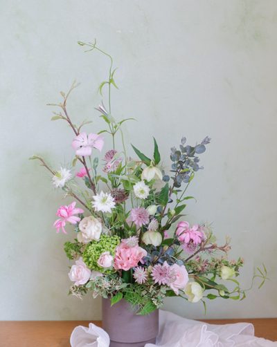 今日は午前中店舗のレッスンルームでワンタイムレッスンが開催されました。 今回のフラワーレッスンのテーマは「Lシェイプのア …