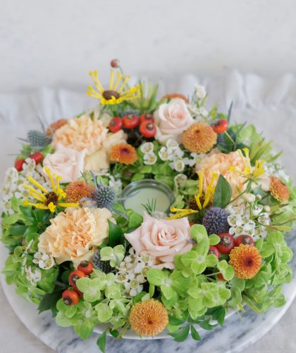 今日は午後、店舗のレッスンルームでワンタイムレッスンを開催しました。 テーマは「テーブルリースアレンジ」。 リース型の吸 …