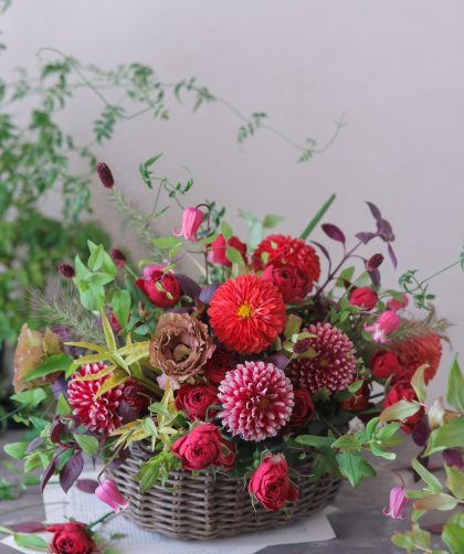 今日は定休日でしたので、恒例の撮影をしました。 今日は秋らしい花材でチキンネットを使って花瓶活けのようにアレンジしました …