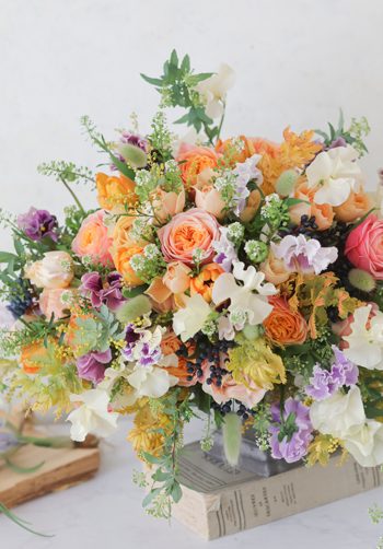 . 春のブーケを束ねました。 スイトピー、タラスピ、バラ、チューリップ、ラナンキュラス、パンジー、こでまり …