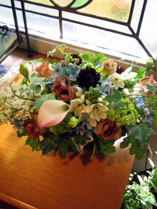 「花材を選ぶ時、濃いブラックボールの矢車草とブラウンの トルコききょうを活けたいと思ったので、まず最初に選びました。 後はそれにあわせていく花材を選びました。」 とおっしゃる智子さん。 今回は高さのあまり無い横に広いウッドBOXが器です。 この器は少しアンティークな雰囲気を持ったものなのですが、 このウッドBOXに今回智子さんが選んだ花材が、とてもよく合っています。 ブラックボール(矢車草)、ブラウンのトルコききょうを引き立てるグリーンの ビバーナム、白のライラック、アラビカムなど、上品なそして、又、 センスの良いチョイスです。 自分で花材を選ぶ時はつい、花だけに目がいってしまい、あれもこれもと 選びがちですが、しっかりと活けたい花とテーマを持って花材を選ぶ事が 大切です。その点、今回智子さんはとても上手に花材を選び、そして、又、 それぞれの花をうまく活かして、アレンジ出来ています。 いつも話題が豊富で、色々な事を教えて下さる智子さん。 又、次のレッスンも楽しみです。 |