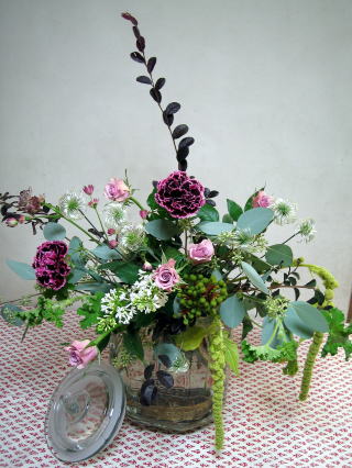 「まず、大好きなひもげいとうの良さをいかすことを考えました。 シルバーがかったバラやクレマチスの種など、トーンを 統一することを心がけました。」 とおっしゃる菜穂子さん。 ひもげいとうの質感(ねこのしっぽのよう)とたれ下がるかわいさは、 他の花材には無いものです。 その良さを生かすには、長さが1つのポイントとなりますが、 菜穂子さんは花器とのバランス、他の花材とのバランスをうまくとっています。 又、菜穂子さんのおっしゃるように、選んだ花材にはグレイトーンが入って いるので、色の統一感が全体に出ています。 少し色の濃い、変わったカーネーションはポイントとして、全体を引き締める 役割をしています。 いつもおしゃれでセンスの良い菜穂子さん。 花選びも常に洗練されていて、お花の事も大変詳しく、花を選ぶその目は とても愛情にあふれています。 |