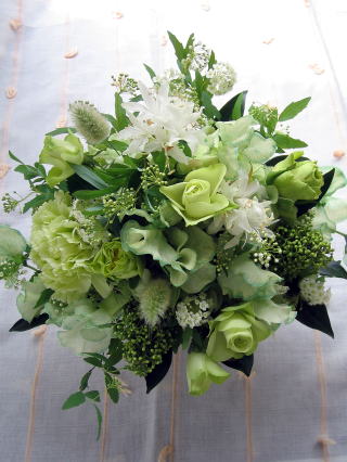 「全体の形のバランスとグリーンアローのバラが綺麗だったので、 その花を一番のポイントに考えました。」 とおっしゃる美恵子さん。 アレンジと器のバランス、アレンジ全体の形、花同士のバランス・ポイントなど、 花を活ける前に、アレンジメントの仕上がりをイメージしてから、 花を挿していくことは、とても大事なことです。 いきあたりばったりで花を作っていくと、次への課題もみつけられませんし、 今回何が良くて、何が悪かったのかも、わからなかったという事がありがちです。 毎回自分自身の中で何かしらのテーマをもって花を活ければ、 次へのステップ、そして上達も早くなります。 今回、美恵子さんはきちんと、自分のテーマを持って花を活けた事で、 とても綺麗なアレンジを作ることに成功しています。 お花が大好きで、いつもレッスンの時には、店内を楽しそうにご覧になっている 美恵子さん。 人柄そのものの、いつも可愛らしい花を活けていらっしゃいます。 どうぞ、素敵な花をこれからも作っていって下さい。 |