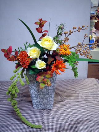 | 第34回目の作品はすみ江さんの作品。 彼女はビューティフルボーイでレッスンを始めて、今年2年目。 今回は花瓶活けのお花をつくりました。 |